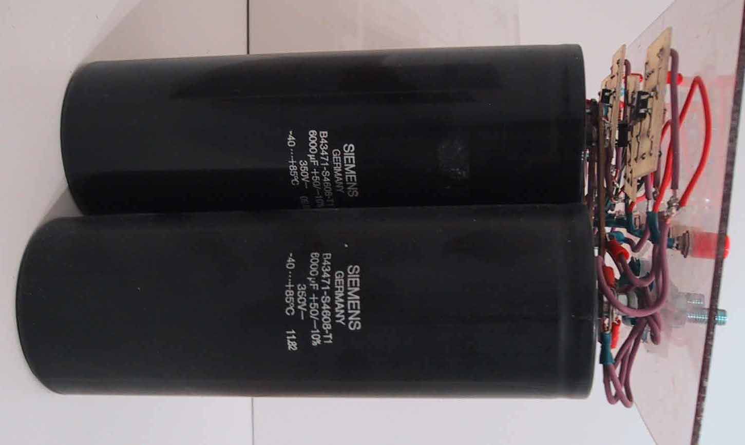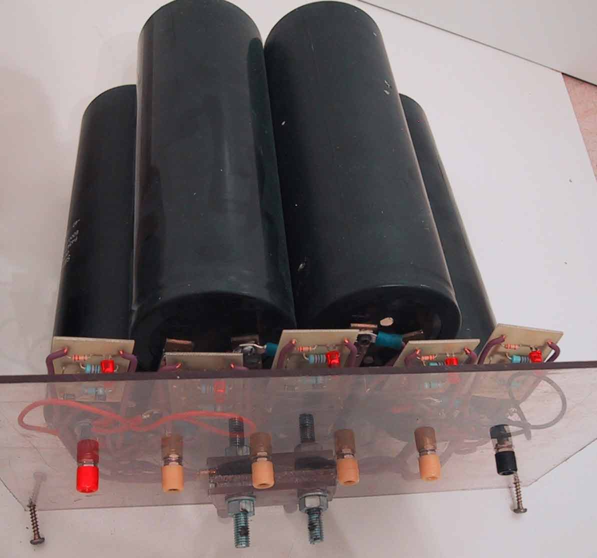 Bei so hohen Spannungen und Energiemengen ist äußerste Vorsicht angebracht, da ein über den Körper geschlossener Stromkeis mit einem Blitzschlag zu vergleichen ist. Diese Capbank ist viel leistungsfähiger als die erste. Sie besteht aus 5 großen Becherelkos, die in Serie geschalten sind um eine höhere Spannung zu erreichen. Die Elkos haben eine Nennkapazität von je 6000µF und eine Spannung von 350V. Berechnen lassen