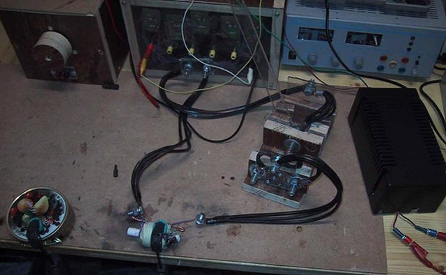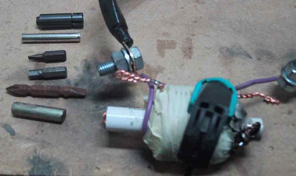 Unten in der Mitte vom Bild ist das Herzstück der Coilgun, die Coil. Sie besteht aus 5 Lagen 1,5 mm² Installationsdraht. Bei jeder Lage ist eine Anzapfung angebracht um den optimalen Punkt zu finden, bei dem die meiste Energie auf das Projektil übertragen wird. Das seltsame Teil in der Mitte ist der Schalter, ganz rechts ist mein Ladegerät für die Capbank. Das Foto hab ich leider erst gemacht, nachdem die Spule schon hinüber war.