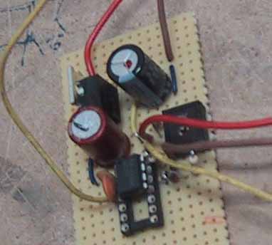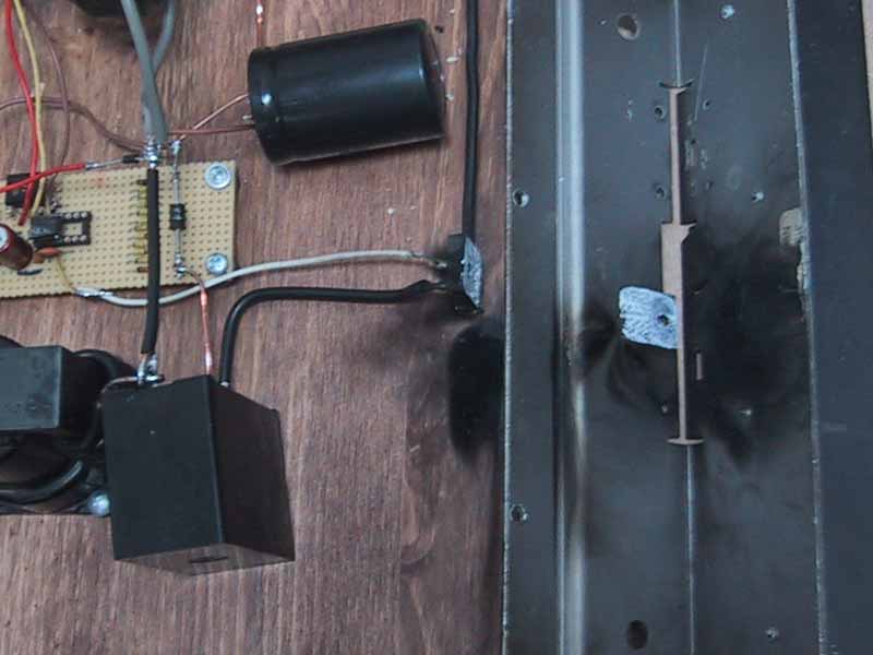 Der Übertrager ist ein normaler Diodensplitttrafo (DST) ohne internem Kondensator aus einem Monitor. Da die interne Primärwicklung des DSTs zu schwach dimensioniert ist, hab ich eine neue Primärwicklung mit einem 2,5 mm² Installationsdraht auf dem Ferritkern angebracht. Zur Takterzeugung wird das Timer-IC NE555 verwendet. Mit dem Tandempoti, das in der Ansteuerschaltung verwendet wird, lässt sich die Frequenz nahezu unabhängig vom Tastverhältnis einstellen. Aufgebaut wurde die Schaltung auf ein Stück Experimentierplatine. Als Stromversorgung wurden zwei 12V Bleigelakkus in Serie geschalten verwendet. |